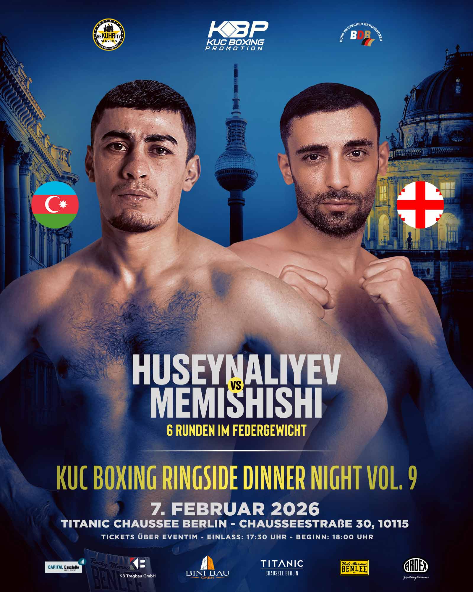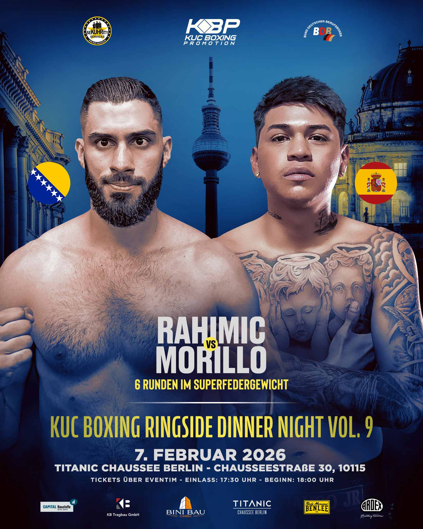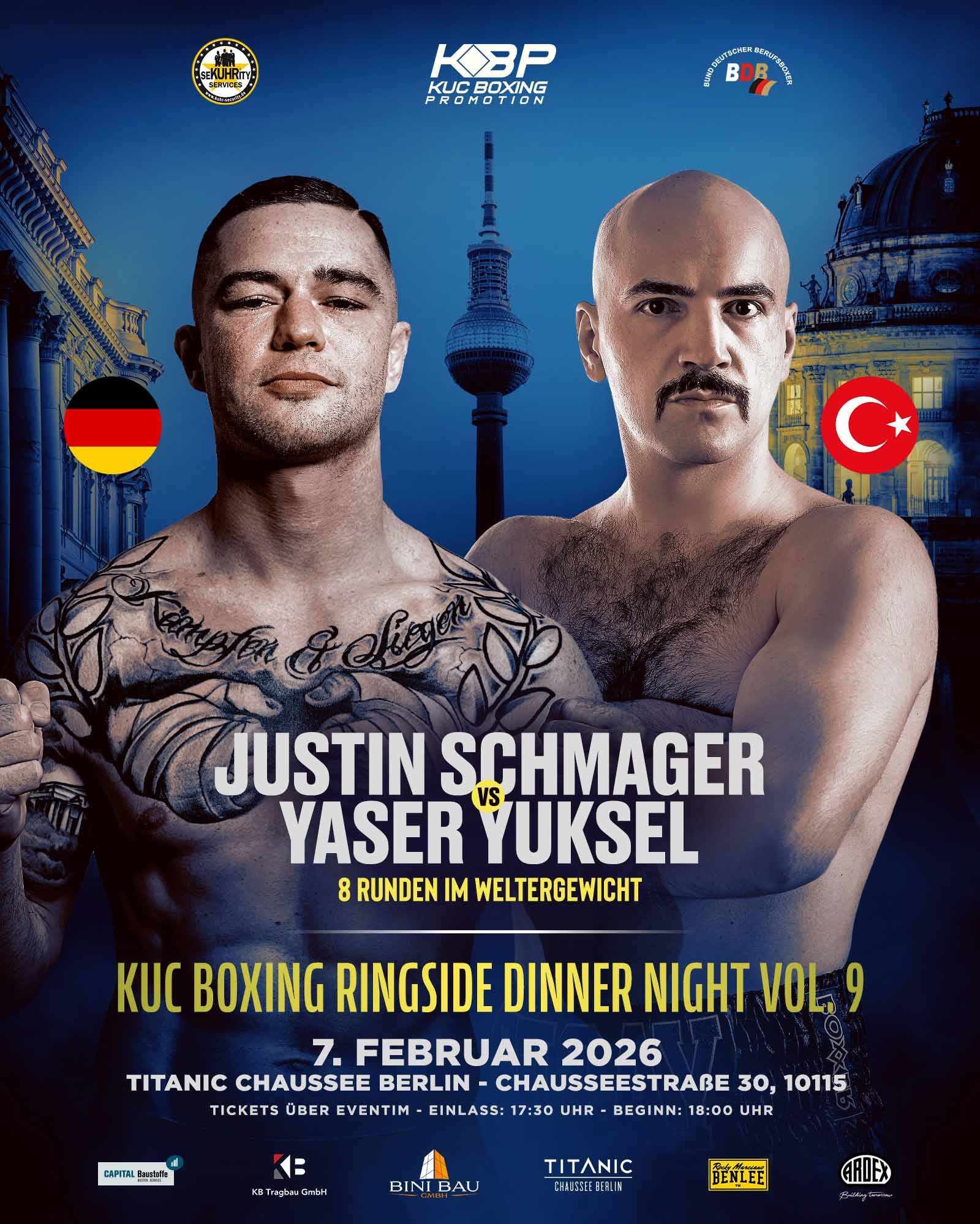 Am 7. Februar 2026 präsentiert die KUC Boxing Promotion die KUC Boxing Ringside Dinner Night Vol. 9 im Titanic Chaussee Berlin. Die Veranstaltung verbindet hochklassigen Profiboxsport mit exklusiver Ringside-Atmosphäre und zählt zu den festen Terminen im Berliner Boxkalender. Einlass ist um 17:30 Uhr, Beginn der Kämpfe um 18:00 Uhr.